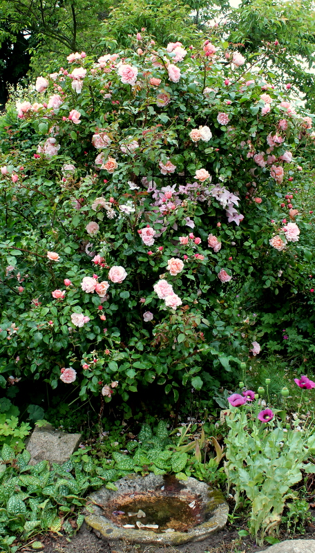 Rosa Helena Lykkefund som vokser helt vildt i det gamle æbletræ.